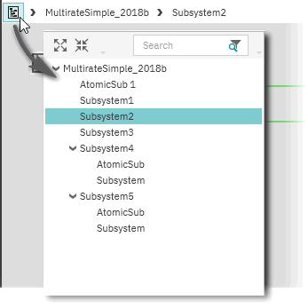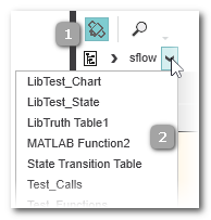Matlab® Simulink® Code kann Submodule/Subprogramme enthalten. Mit Hilfe der Breadcrumb-Leiste (2) unterhalb der Symbolleiste können Sie zwischen den Modulen und deren Subprogrammen navigieren. In unserem Beispiel enthält das Module sflow mehrere Subprogramme (Simulink®, Stateflow Charts, Truth Tables usw.).
