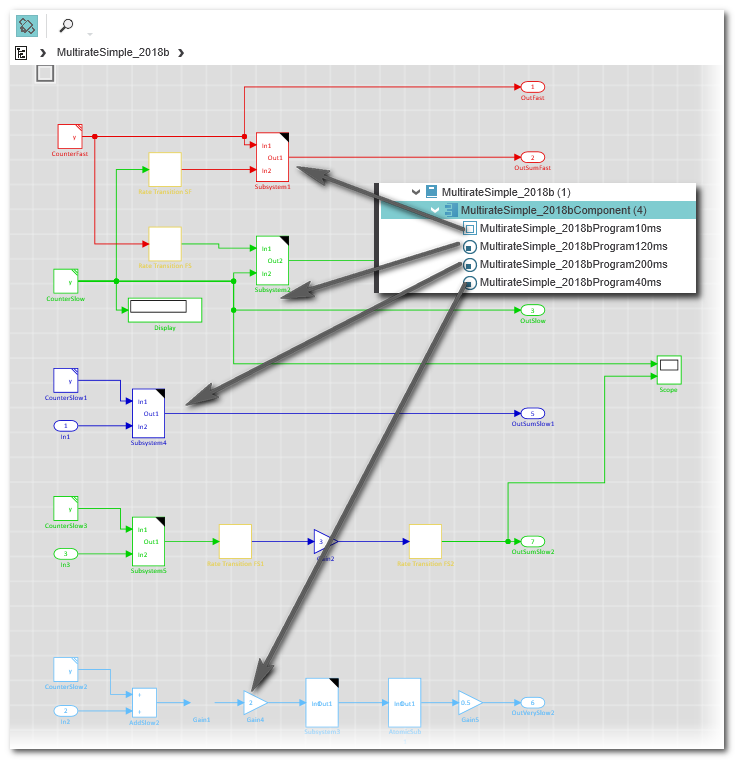 Wie in der Einführung beschrieben, kann ein Matlab®-Programm mehrere Teilprogramme enthalten, die mit verschiedenen Tasks in ihrer Solution verknüpft werden können. Dadurch können innerhalb eines Modells unterschiedliche Update-Zyklen verwendet werden. Detaillierte Informationen hierzu finden Sie in den Abschnitten "Multirate-Programme bestehend aus mehreren Teilprogrammen" und "Matlab®-Code in ihrer Solution integrieren".