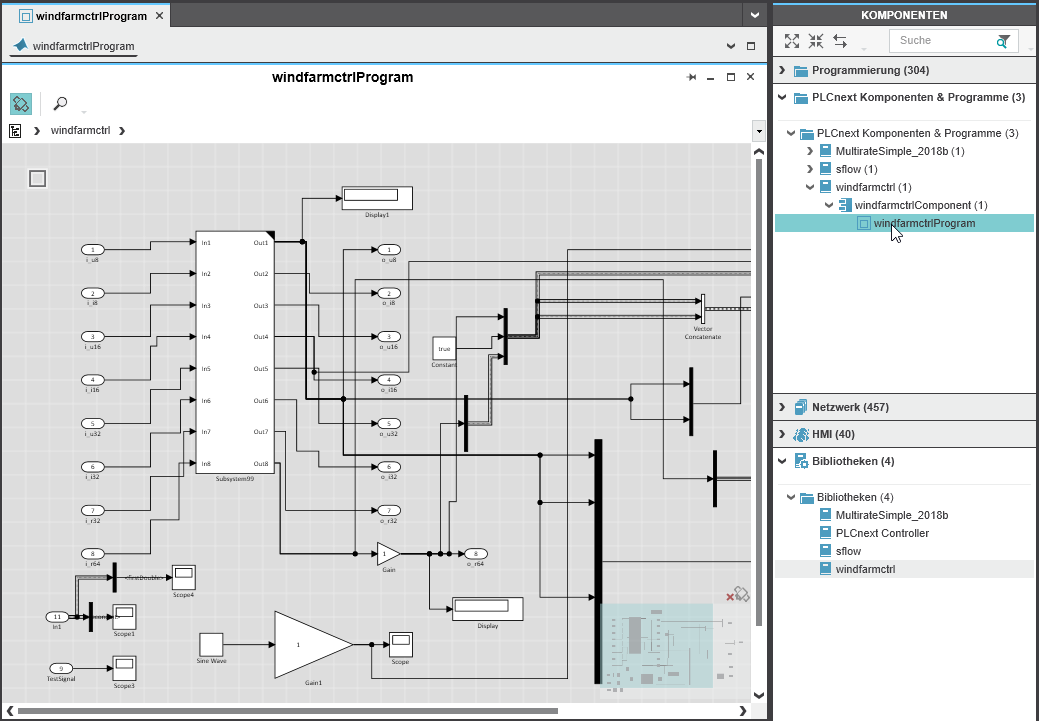 Um ein Matlab®-Programm im jeweiligen Viewer zu öffnen, doppelklicken Sie in den KOMPONENTEN unter 'PLCnext Komponenten & Programme' auf den entsprechenden Typ. Enthält das Programm Submodule/Subprogramme, können Sie mit der Breadcrumb-Leiste zu den Elementen navigieren (siehe unten).