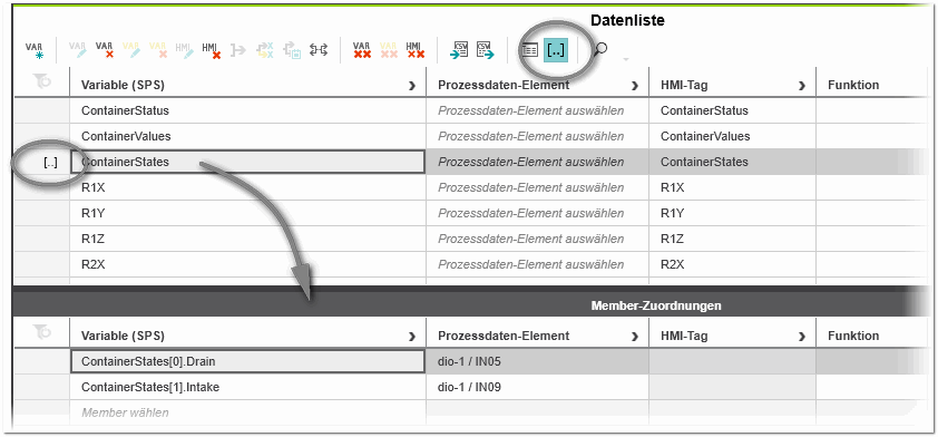 Der Editor verhält sich wie der 'Datenliste'-Editor. Die Zuordnung eines UDT-Elements zu einem Prozessdatenelement erfolgt durch Auswahl eines Elements des UDT in der Zelle 'Member wählen' und anschließender Auswahl eines Prozessdatenelements in der Spalte 'Prozessdaten-Element'. Wenn mindestens eine Member-Zuordnung für den UDT vorhanden ist, wird dies durch das Zeichen "[...]" in der Variablenzeile im Editor 'Datenliste' angezeigt (wie im folgenden Beispiel dargestellt).