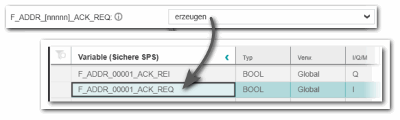 Es werden zwei Kategorien von Profisafe-Systemvariablen unterschieden:- F-Device-bezogene Systemvariablen: Verfügbar für jedes konfigurierte Profisafe-Gerät. Diese gerätespezifischen Systemvariablen enthalten die F-Adresse (XXXXX) des betroffenen Geräts im Variablennamen: F_ADDR_XXXX_*.