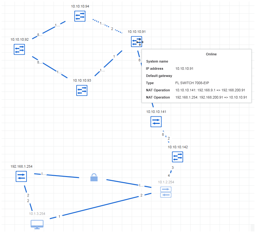 In der physikalischen Topologie ist der NAT-Router durch ein spezielles Symbol dargestellt (siehe unten). Wenn Sie einen NAT-Client auswählen, werden der bzw. die NAT-Router, welche eine Adressübersetzung für das ausgewählte Gerät durchführen, in der Topologie hervorgehoben (alle anderen NAT-Clients werden grau dargestellt). Wenn Sie einen NAT-Router markieren, werden alle NAT-Clients, für welche der Router eine Adressübersetzung durchführt, in der Topologie hervorgehoben (nicht betroffene NAT-Clients werden ausgegraut). Der Gerätetooltip zeigt u.a., welche NAT-Operationen für das Gerät durchgeführt werden (siehe unten stehendes Beispiel). Nicht-NAT-Clients erscheinen in der Topologie ausgegraut.