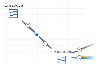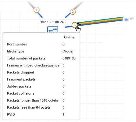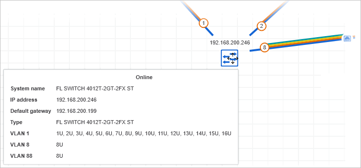 In der Netzwerktopologie werden die VLAN-Switchports durch eine farbige Linie bis zur Mitte der Verbindung und die Ports mit einer farbig umrandeten Portnummer dargestellt (wie im unten stehenden Beispiel gezeigt). Einen Tagged-Port erkennen Sie an der gestrichelten Verbindungslinie. Untagged Ports werden durch durchgezogene Linien dargestellt. In welcher Farbe die Linien- und Portnummern angezeigt werden, hängt von der Farbe ab, die der jeweiligen VLAN-ID zugeordnet ist. Welche VLANs (VLAN-IDs) in der Topologie angezeigt werden sollen und in welcher Farbe kann im Subeditor 'VLANs' unterhalb des Topologie-Editors ausgewählt werden (siehe hierzu die unten stehende Beschreibung).