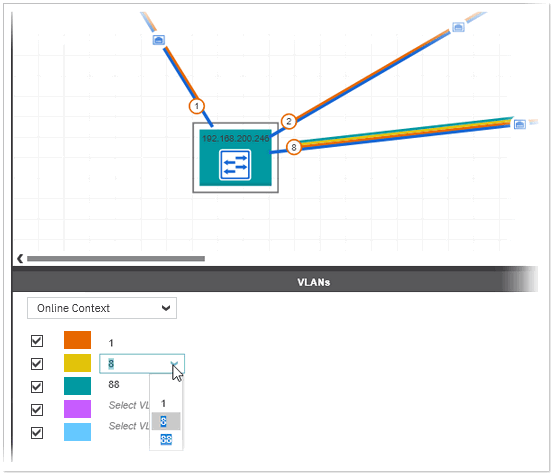 In der Netzwerktopologie können maximal fünf VLANs (VLAN IDs) gleichzeitig angezeigt werden. Wenn Ihr Netzwerk mehr als fünf VLAN-IDs enthält, müssen Sie die VLAN-IDs, die Sie gleichzeitig anzeigen möchten, mit dem Subeditor 'VLANs' auswählen.