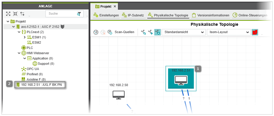 Beim Scannen des Netzwerks mit den eingestellten Scan-Optionen vergleicht PLCnext Engineer verschiedene Werte, wie z.B. die IP-Adresse, Subnetzmaske usw. der Projektgeräte (die in der ANLAGE enthaltenen Geräte) mit den Werten der Online-Geräte.