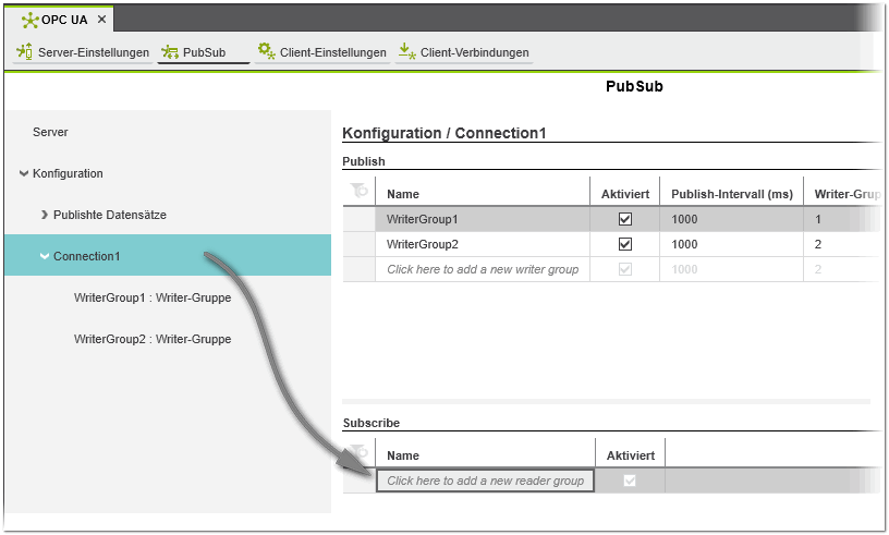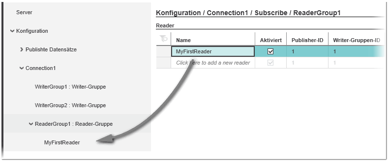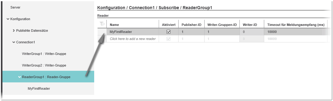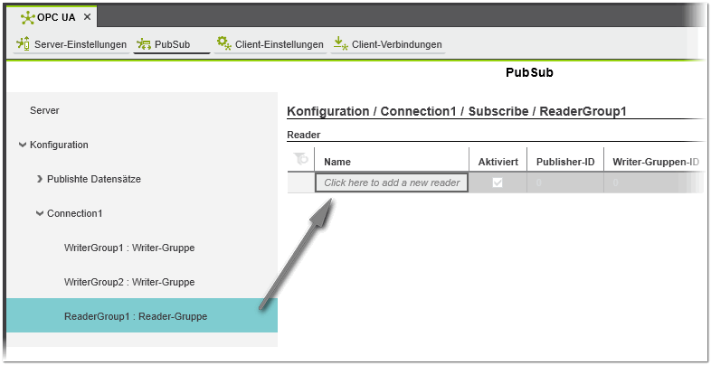 Zusätzlich zum manuellen Hinzufügen einer neuen Reader-Gruppe, wie im folgenden Verfahren beschrieben, können Sie auch eine Reader-Gruppe und die enthaltenen Reader aus einer externen PubSub-Konfiguration eines Remote-OPC UA-Servers importieren. Siehe hierzu das Thema "Externe Konfigurationen von Remote-Servern importieren". |