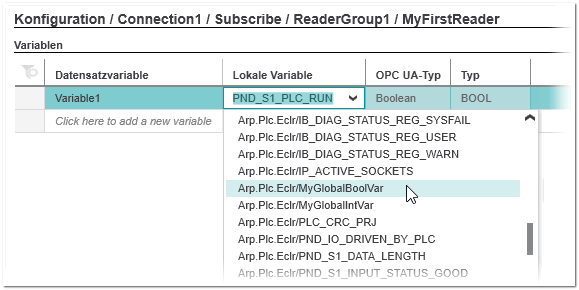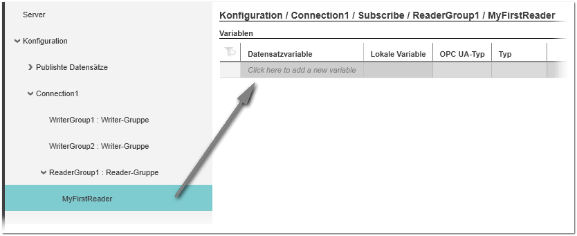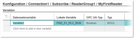 Da die Konfiguration des Publishers und der Subscriber in verschiedenen Projekten vorgenommen wird, kann die Einhaltung dieser Mappingregeln nicht automatisch überprüft werden. Stellen Sie beim Konfigurieren des Readers sicher, dass die notwendigen Informationen über die Werte im subscribten Datensatz vorhanden sind und berücksichtigt werden.Gemäß dieses definierten Mappings empfängt der Reader im Betrieb die im Datensatz enthaltenen Werte von allen durch die Publisher-ID und die Writer-Gruppen-ID spezifizierten Writern, innerhalb des dort definierten Publishing-Intervalls.Sie können die Reihenfolge der eingefügten Variablen in der Tabelle per Drag & Drop ändern: Klicken Sie auf einen Eintrag in der Zeilenüberschrift und halten Sie die Maustaste gedrückt, während Sie die Maus bewegen.- Klicken Sie rechts in der Tabelle 'Variablen' in das leere Feld 'Datensatzvariable'.