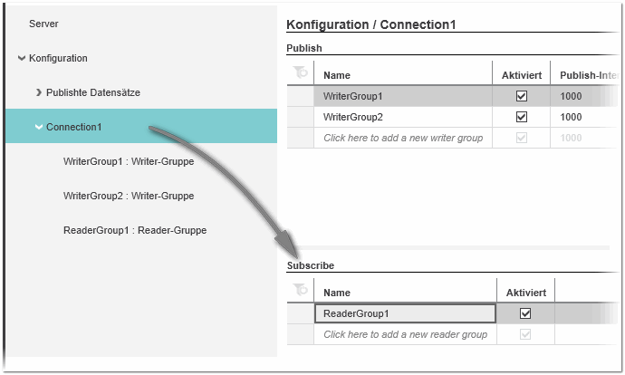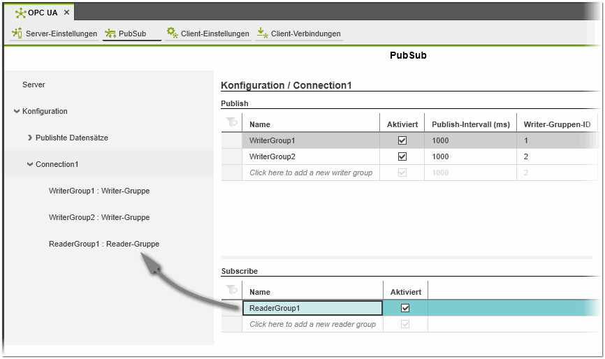 Die Eigenschaften von Reader-Gruppen werden in der 'Subscribe'-Tabelle (auf dem Knoten 'Verbindung') angezeigt und können dort bearbeitet werden.