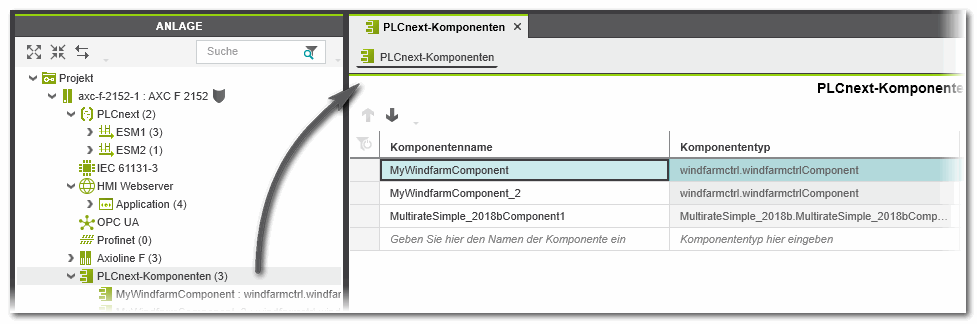 In Ihrem Projekt ist eine PLCnext-Komponente, die per Bibliothek eingebunden ist, im 'PLCnext-Komponenten'-Editor der ANLAGE instanziiert. Komponenteninstanzen werden automatisch erzeugt, wenn ein im Komponententyp enthaltener Programmtyp instanziiert wird oder sie können manuell im 'PLCnext-Komponenten'-Editor angelegt werden.