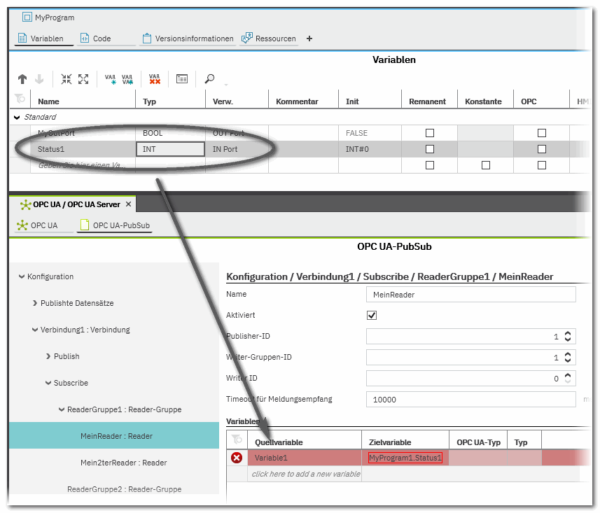 In der Konfiguration der OPC UA PubSub-Kommunikation ist ein subscribtes Datenelement auf eine Variable gemappt, die in Ihrer Konfiguration nicht verfügbar ist.