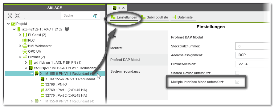 Der Multiple Interface Mode ist unter folgenden Bedingungen möglich:- Der Profinet Controller unterstützt diese Betriebsart,