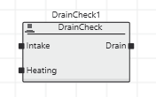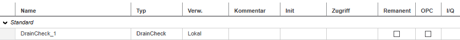 Der Instanzname muss in der Variablentabelle der aufrufenden POE deklariert werden. Im folgenden Beispiel ist DrainCheck_1 der Name der FB-Instanz DrainCheck.