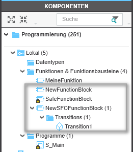Wenn Ihr Projekt eine sicherheitsbezogene SPS enthält, können Sie sicherheitsbezogene Anwender-FBs in der Kategorie 'Programmierung' des KOMPONENTEN-Bereichs anlegen.