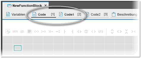 - Code-Arbeitsblätter werden schreibgeschützt angezeigt (grauer Hintergrund). Editieren ist nicht möglich.
