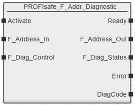 The FB reads the output interface data of an F-Host instance and shows them as 16 bit value at its output formal parameter F_Diag_Status. This way, a required acknowledgement can be indicated. Via the input formal parameter F_Diag_Control, the 16 bit input interface data of the F-Host instance can be written and thus controlled. This way, acknowledging of diagnostic messages is possible.