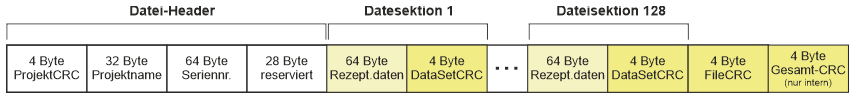 Am Anfang der Datei befindet sich der Header, gefolgt von bis zu 128 Datensätzen (Sektionen) mit den eigentlichen Rezepturdaten. Jede Sektion hat zum Schutz der Daten ihre eigene CRC (DataSetCRC). Am Ende der Datei stehen eine Dateiprüfsumme (FileCRC) und eine Gesamtprüfsumme, die beide unten beschrieben sind. Die Anzahl der Datensätze pro Datei ist variabel (konfigurierbar) und hängt vom Typ der Sicherheitssteuerung ab.