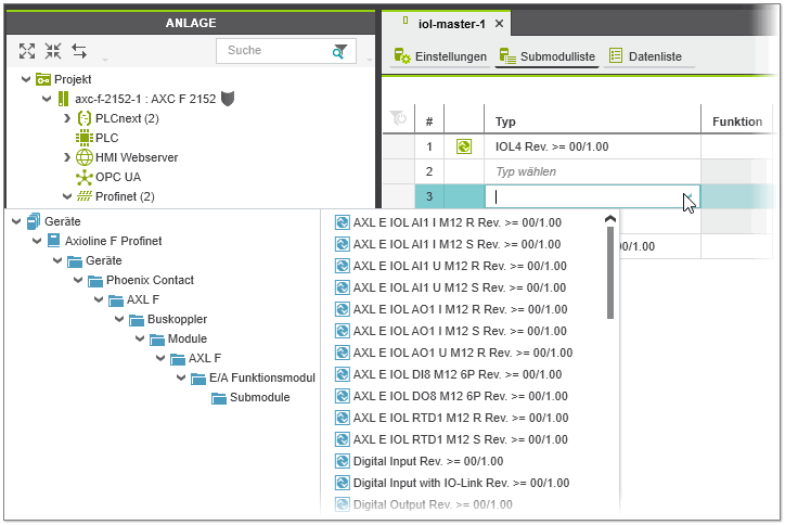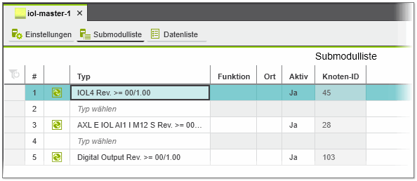 - Doppelklicken Sie in der ANLAGE unter dem Profinet-Buskoppler-Knoten auf den IO-Link-Master und öffnen Sie den Editor 'Submodulliste'. Der Editor 'Submodulliste' zeigt die Portliste des I/O-Link-Masters (jede Tabellenzeile entspricht einem IO-Link-Port).