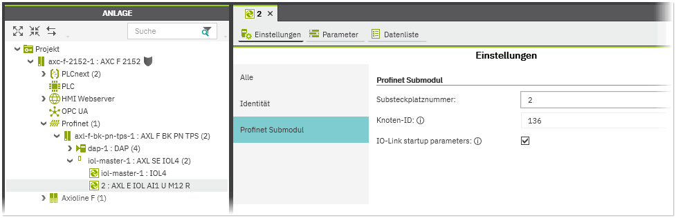 Die gerätespezifischen Anlaufparameter für das IO-Link-Gerät sind standardmäßig in der Profinet-Konfiguration eingebunden. Sie können das automatische Einbinden der Anlaufparameter in die Profinet-Konfiguration deaktivieren (d.h. die Parameter werden nicht auf das IO-Link-Gerät geschrieben). Gehen Sie dazu in den 'Einstellungen'-Editor des Geräts und deaktivieren Sie in der Kategorie 'Profinet Submodul' das Kontrollkästchen 'IO-Link-Anlaufparameter'.