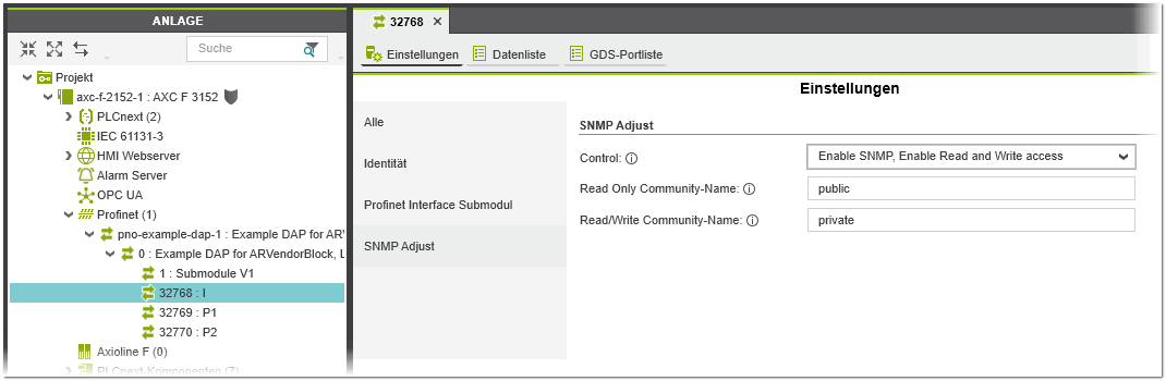 Konfigurieren Sie in der Kategorie 'SNMP Adjust' des Profinet I/O-Controllers oder des Profinet-Submodul-Interface die folgenden SNMP-Parameter: