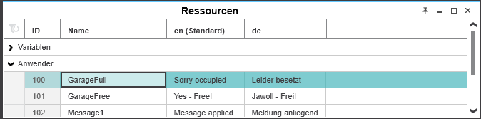 - Im 'Ressourcen'-Editor sind alle übersetzbaren Variablenkommentare (Abschnitt 'Variablen') und freie Kommentare im Abschnitt 'Code' bereits gesammelt.Im Abschnitt 'Anwender' können Sie freie anwenderdefinierte Texte eingeben.