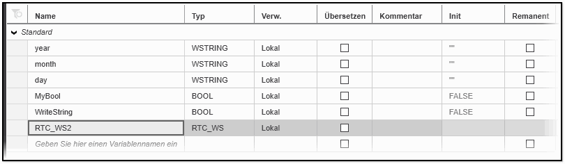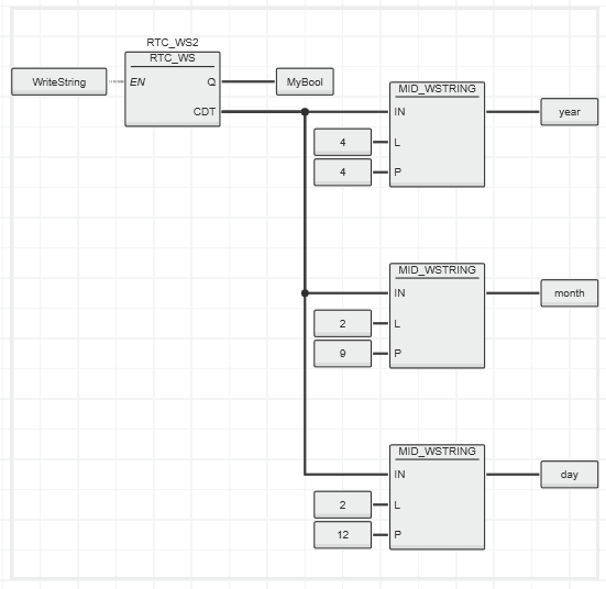 Als Ergebnis erzeugt der Funktionsbaustein RTC_WS eine Zeichenfolge mit dem aktuellen Datum und der aktuellen Uhrzeit. Die gesamte Zeichenfolge ist in die einzelnen Elemente year, month und day aufgeteilt. Die MID_WSTRING-Funktionen dienen zum Extrahieren von Zeichenfolgeelementen.