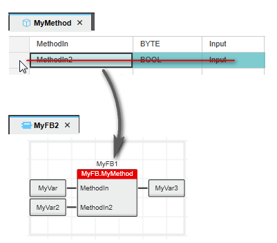 MyMethod enthielt ursprünglich 2 Eingangsparameter MethodIn und MethodIn2. Mit dieser Implementierung wird die Methode im Code aufgerufen. Anschließend wurde in Implementierung der Methode MethodIn2 entfernt. Der Methodenaufruf wird in der Folge unzulässig.