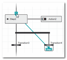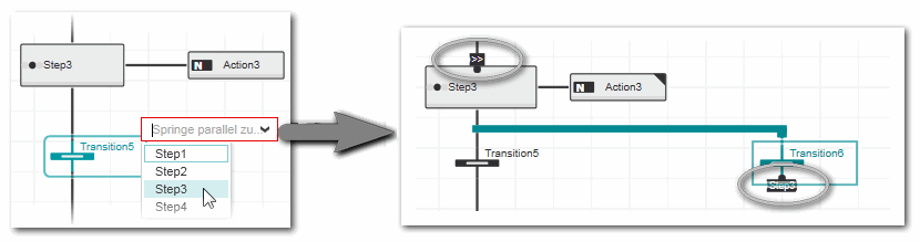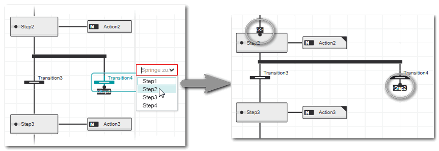 Ein Sprung zwischen Transition und Zielschritt ist durch einen Konnektor nach der Transition dargestellt. Das Sprungziel (der Zielschritt) ist mit dem Symbol ">>" gekennzeichnet (siehe folgendes Beispiel). Der Konnektor besitzt den Namen des Zielschritts, der aktiviert wird, wenn die Transitionsbedingung den Wert TRUE liefert (der Name wird bei einer Änderung des Schrittnamens automatisch geändert).