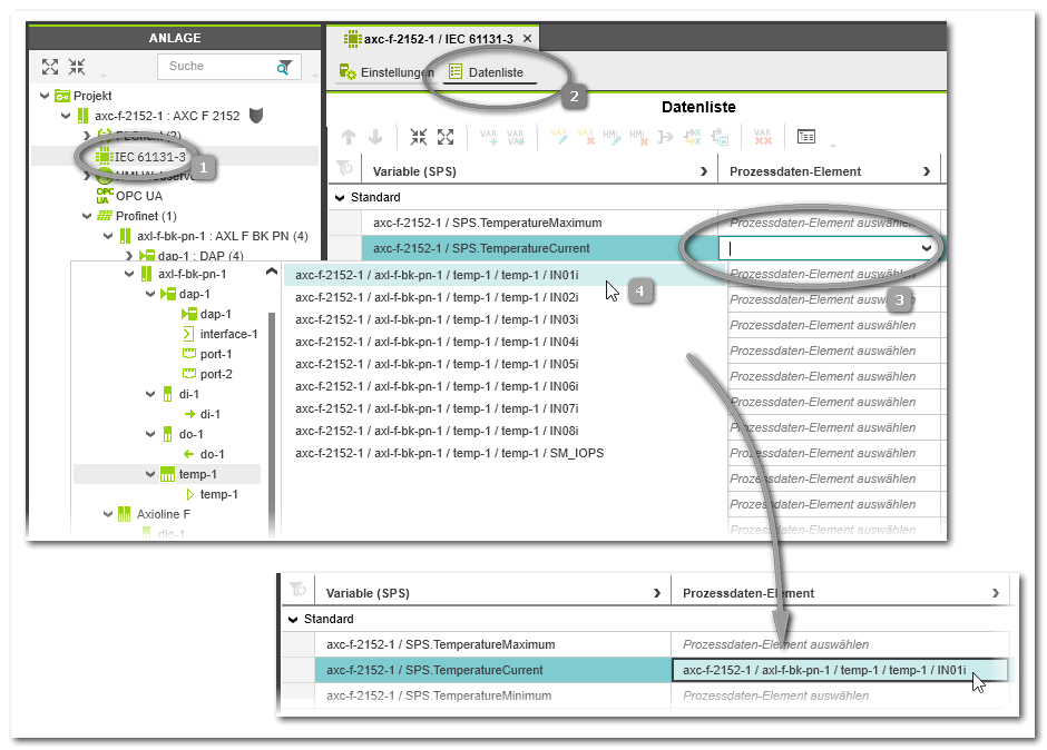 Je nachdem, für welches Element in der ANLAGE die 'Datenliste' geöffnet wurde, enthält sie mehr oder weniger Prozessdaten-Elemente. Für ein bestimmtes Gerät geöffnet, werden nur die Prozessdaten-Elemente dieses Geräts angezeigt. Für den 'IEC 61131-3'-Knoten geöffnet, können darin alle (nicht-sicherheitsbezogenen) Standard-Prozessdaten aller Module der ANLAGE zugeordnet werden. - Linksklicken Sie in der 'Datenliste' in die Zelle 'Prozessdatum' der betreffenden Variablen (3) und wählen Sie in der Auswahlliste das gewünschte Prozessdaten-Element (4). Die Auswahlliste enthält nur die Prozessdaten-Elemente, die für die Verbindung mit der betreffenden Variablen geeignet sind (passender Datentyp).