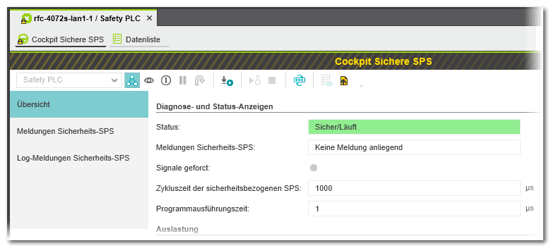 Neben den wichtigsten Steuerfunktionen stellt das Sicherheitscockpit wesentliche Diagnoseinformationen der sicherheitsbezogenen SPS bereit.