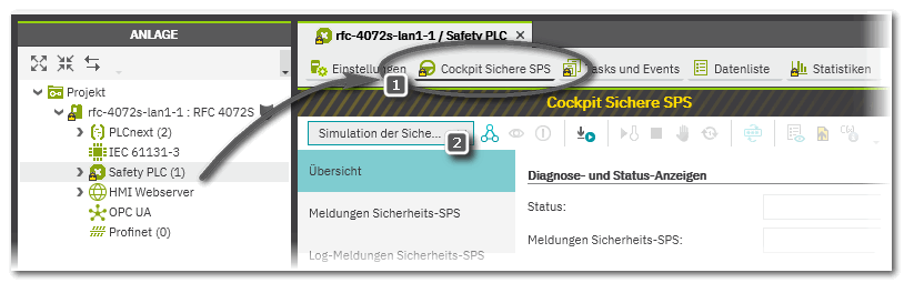3. Wählen Sie im 'Cockpit Sichere SPS' aus der Dropdownliste den Eintrag 'Simulation der sicheren SPS' (Nr. 2 im Bild oben).