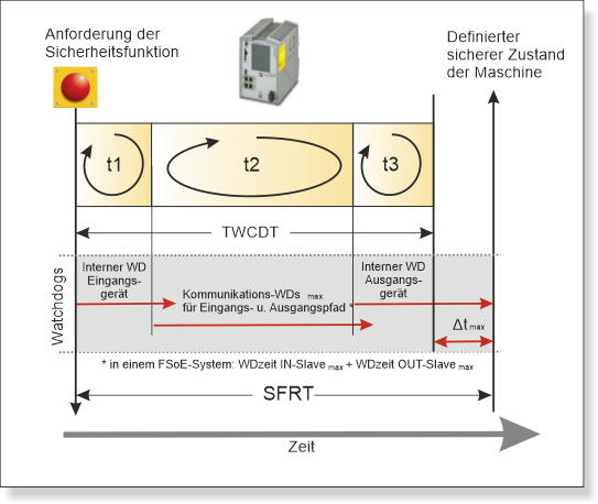 Abhängig von der SFRTmax müssen Sie die resultierende maximale Überwachungs-/Watchdogzeit als oberen Grenzwert für jede einzelne Sicherheitsfunktion bestimmen. Ist beispielsweise der WD für ein sicherheitsbezogenen Ausgangsgerät größer eingestellt, als das Gerät tatsächlich benötigt um das Ausgangssignal zu verarbeiten, ergibt sich daraus ein Zeitdelta Δt. Dieses Zeitdelta muss bei der Planung des Safety-Systems berücksichtigt werden.