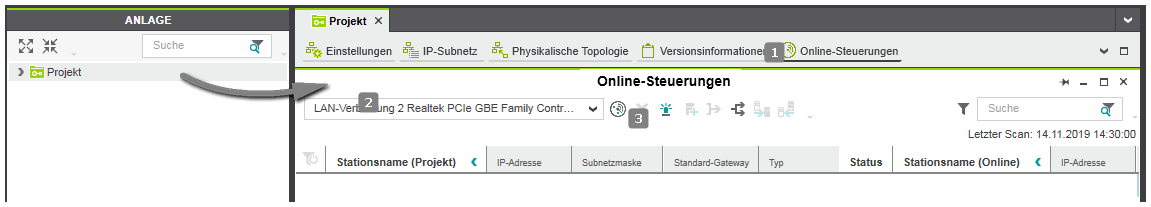Öffnen Sie im Editorenbereich den 'Online-Steuerungen'-Editor (siehe (1) in der Abbildung unten). - Wählen Sie in der Dropdownliste (2) den LAN-Adapter Ihres Computers, der mit dem zu scannenden Netzwerk verbunden ist.