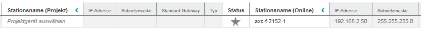 Die Spalten links von der 'Status'-Spalte enthalten die im Projekt bearbeitete Konfiguration. Diese Spalten sind leer, da Sie mit einem leeren Projekt begonnen und die gefundene Steuerung noch nicht zugewiesen haben.Das