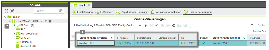 Die 'Online-Steuerungen'-Tabelle wird auf der Projektseite mit dem von der Steuerung gelesenen Namen und den Kommunikationseinstellungen aktualisiert. Der 'Status' wird auf 'OK' (grün) gesetzt, d.h. die in den Tabellenspalten angezeigten Werte von Projekt- und Online-Gerät sind identisch. Siehe (1) im folgenden Beispiel.Die Steuerung erscheint als Knoten mit ihrem konfigurierten Stationsnamen in der ANLAGE (2).Hinweis