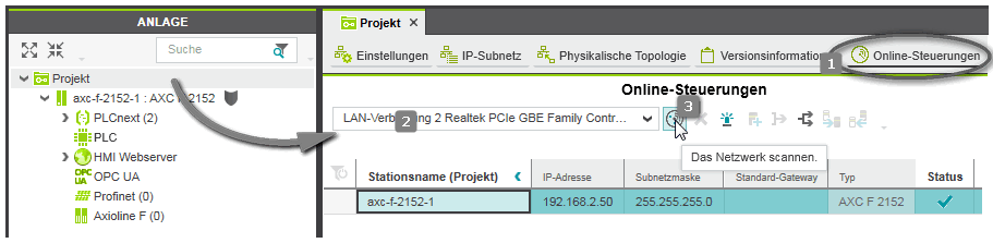 Um das Netzwerk wie hier beschrieben zu scannen, ist es nicht notwendig, vorher manuell eine Kommunikationsverbindung herzustellen (mit dem Befehl 'Verbinden' im Kontextmenü der Steuerung in der ANLAGE). PLCnext Engineer führt dies automatisch durch.