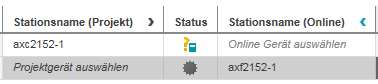 Öffnen Sie in diesem Fall die Dropdownliste 'Stationsname (Online)' in der Tabellenzeile mit der in der ANLAGE angegebenen Steuerung. Wählen Sie die Kennung der gescannten Steuerung, um sie dem Stationsnamen auf Projektseite zuzuweisen.