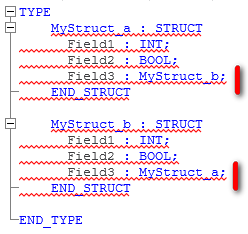 In einem Datentyp-Arbeitsblatt sind zwei anwenderdefinierte Datentypen deklariert, die Referenzen auf sich selbst oder auf einander enthalten. Dies ist nicht zulässig, da sich hierdurch eine rekursive Abhängigkeit ergeben würde.