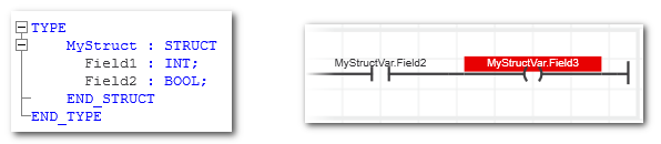 Der anwenderdefinierte Datentyp MyStruct ist wie nachfolgend gezeigt deklariert. In einer FBS/KOP-POE ist die Variable MyStructV vom Datentyp MyStruct deklariert. Im FBS/KOP-Code soll das nicht existierende Strukturelement Field3 geschrieben werden.