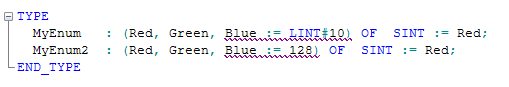 Beispiele für Fehler: In MyEnum passt das Literal LINT nicht zum Datentyp SINT. In MyEnum2 wird der Wertebereich von SINT überschritten.