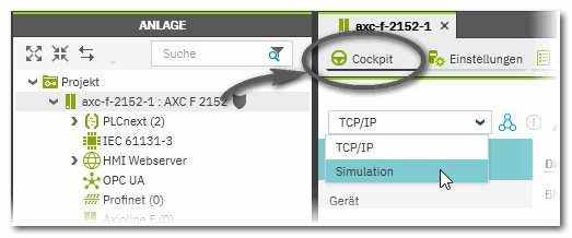 - Sie führen in PLCnext Engineer dieselben Schritte aus, wie bei der Arbeit mit dem physikalischen Netzwerk, wobei Sie darauf achten müssen, dass im Cockpit der Steuerung der Eintrag 'Simulation' ausgewählt ist. Während der Simulation können Sie wie gewohnt Variablen forcen oder in den Editoren Online-Werte anzeigen.
