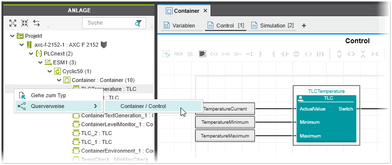 Sind die Querverweise aktuell (siehe hierzu den folgenden Hinweis), können Sie aus dem Instanzbaum unter dem 'PLCnext'-Knoten direkt zum Aufruf eines Funktionsbausteins in einem Code-Arbeitsblatt springen. Das 'Querverweise'-Untermenü im Kontextmenü einer FB-Instanz enthält das Code-Arbeitsblatt, in welchem der FB verwendet wird.