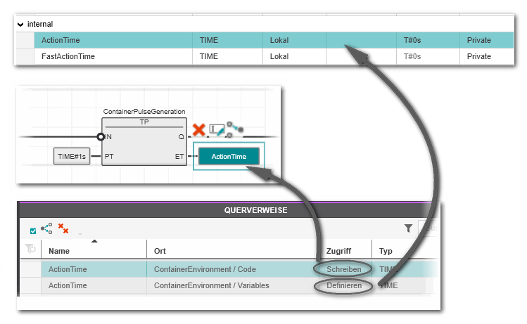 Nach dem Sammeln der Querverweise wird durch Doppelklicken auf einen Listeneintrag direkt in den entsprechenden Editor oder in die entsprechende Datenliste gesprungen.