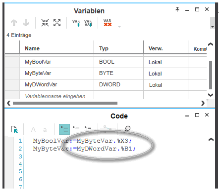 Gemäß IEC 61131-3 (3. Ausgabe) ist ein teilweiser Zugriff auf ein spezielles Bit, Byte, Wort oder Doppelwort einer Variable des Datentyps ANY_BIT möglich. Sie programmieren den teilweisen Zugriff auf eine Variable durch Anfügen eines Punktes (.) an den Variablennamen gefolgt von einem '%'-Zeichen, dem Präfix für die Größe und einer Ganzzahl (von 0 bis max).