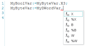 Die Intellisense-Funktion im Texteditor und im grafischen Editor unterstützt ebenfalls den Zugriff auf einen bestimmten Teil einer ANY_BIT-Variablen.
