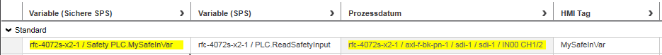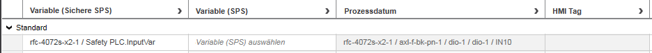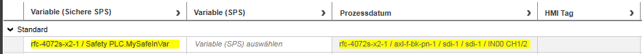 Diese Zuordnung erscheint sowohl in der Datenliste der Standard-Steuerung als auch in der 'Safety PLC'-Datenliste.