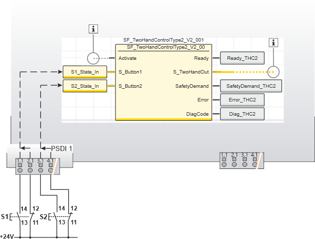 This example shows the connection of a type 2 two-hand control device with the safety-related SF_TwoHandControlType2 function block.