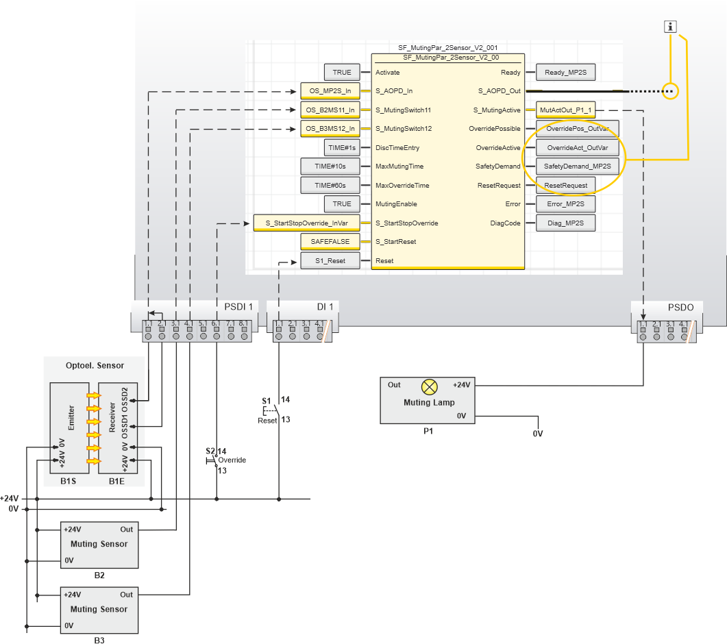 - The S_MutingActive output of the function block controls muting lamp P1 in order to signal the state "muting active". This muting lamp is connected to output terminal 1.1 of the safety-related output device PSDO. The assigned global I/O variable MutActOut_P1_1 is connected to the S_MutingActive function block input.