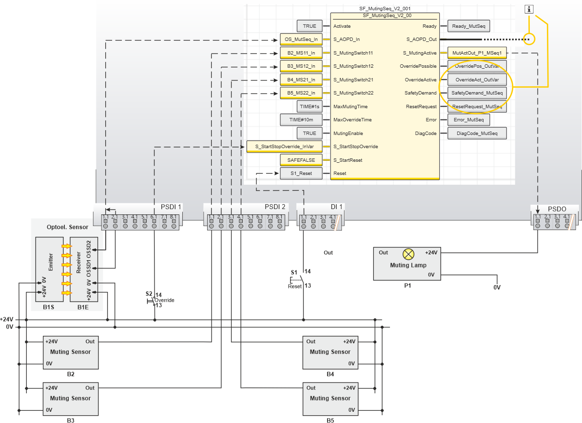 - The S_MutingActive output of the function block controls muting lamp P1 in order to signal the state "muting active". This muting lamp is connected to output terminal 1.1 of the safety-related output device PSDO. The assigned global I/O variable MutActOut_P1_MSeq1 is connected to the S_MutingActive function block input.