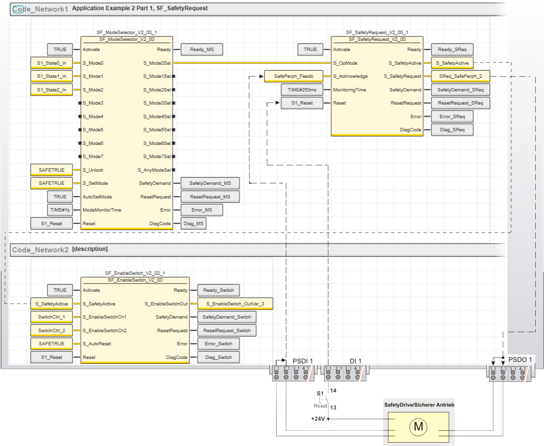 - Das Rückmeldesignal zur Bestätigung der angewählten Betriebsart vom sicherheitsbezogenen Antrieb ist zweikanalig an die Eingänge 1.1 und 2.1 des sicherheitsbezogenen Eingangsgeräts PSDI 1 angeschlossen. Das vom sicherheitsbezogenen Eingangsgerät auf Äquivalenz ausgewertete Signal ist mit der globalen I/O-Variablen SafePerph_Feedb verknüpft und zur Auswertung an Eingang S_Acknowledge des Funktionsbausteins SF_SafetyRequest angeschlossen.