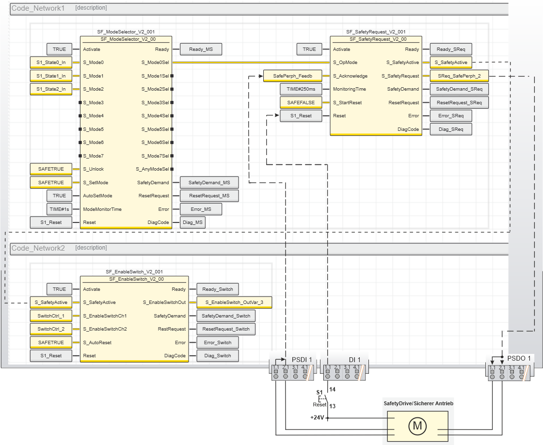 - The S_OpMode input of the SF_SafetyRequest function block is directly connected to the S_Mode0Sel enable signal of the upstream SF_ModeSelector function block. The request for the safety-related function (of the evaluated mode selector switch) is consequently the selection of the operating mode 0. In our example this is the commissioning or maintenance mode in which the drive is operated with safely limited speed.